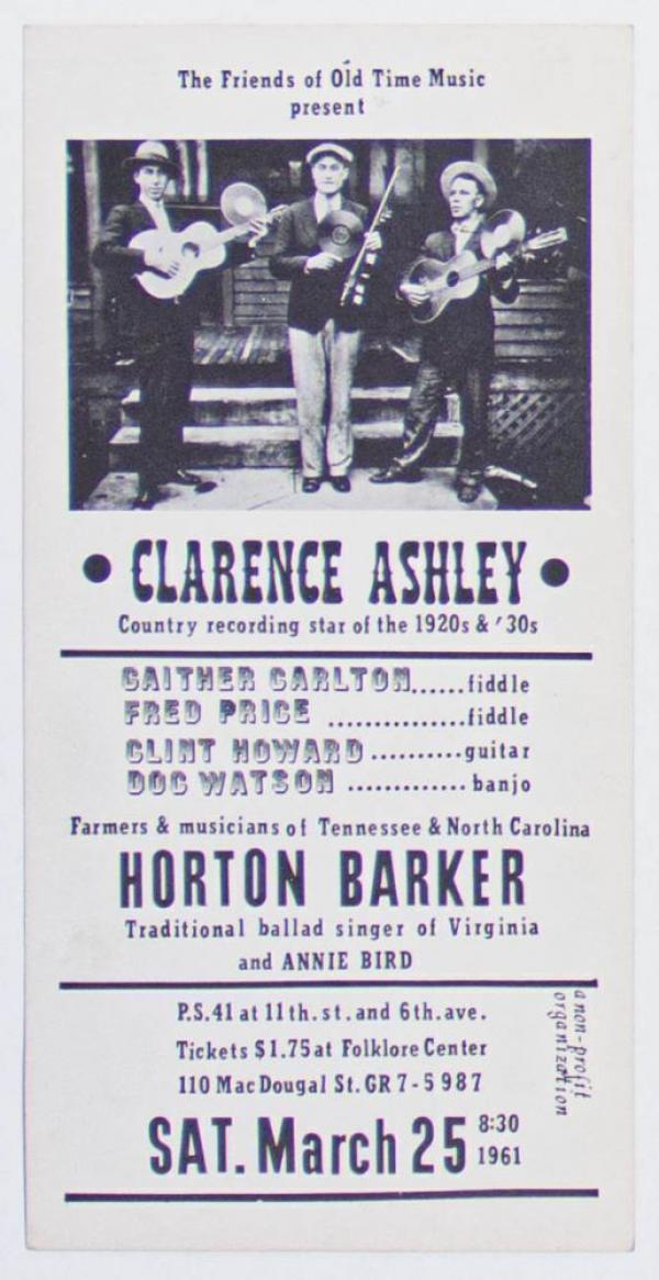 1961 Clarence Ashley Doc Watson P.S. 41 Greenwich Village Handbill Near Mint 87