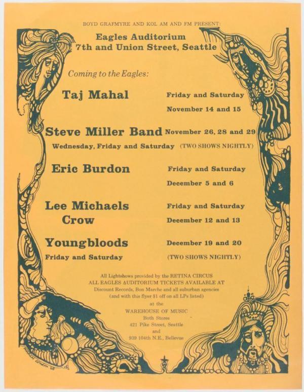 1968 Taj Mahal Steve Miller Eric Burdon Eagles Auditorium Handbill Near Mint 80