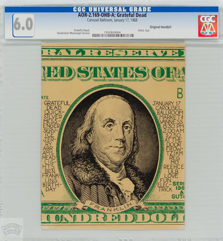 Here’s one of the most popular, original handbills from the Carousel Ballroom series, finally appearing with CGC grading for just the second time in our auction! The famed Hells Angel / Artist - Gut, created this memorable 1968 Grateful Dead issue. This concert was held on January 17th, Ben Franklin’s Birthday, and was the grand opening for the 6 month long Carousel / Grateful Dead / Jefferson Airplane experiment. The Carousel Ballroom was a short-lived venture that was funded and managed by the Dead and Airplane. After they lost enough money and realized it was not their game, the space was taken over by Bill Graham and became the Fillmore West.