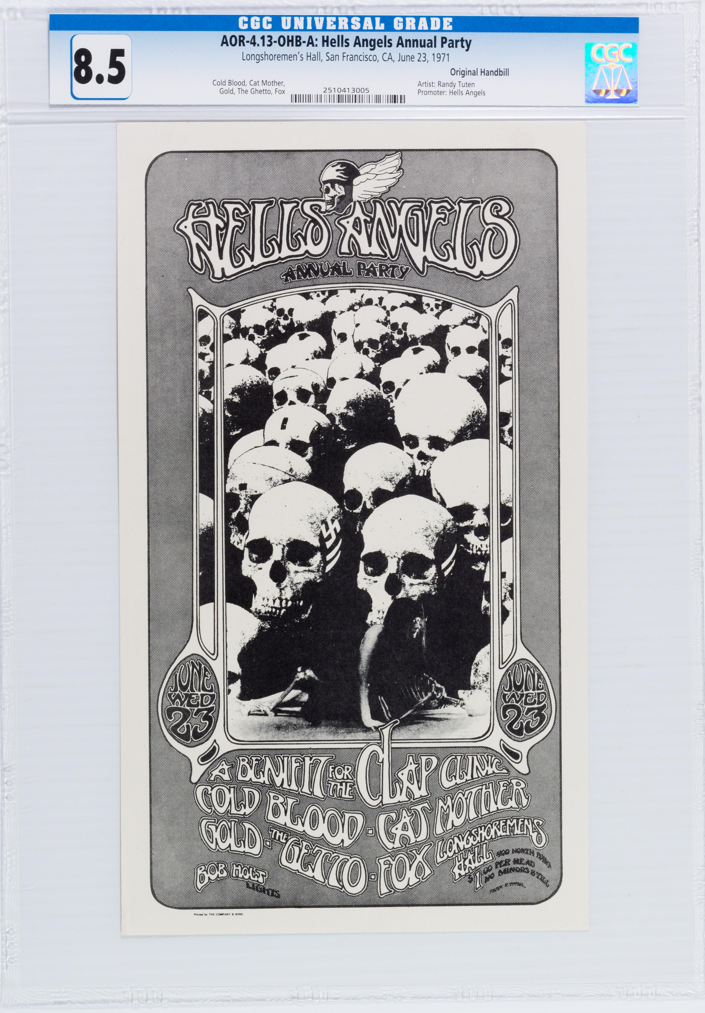 Though we have sold the poster that accompanies this piece, this is the FIRST TIME we are offering this handbill in a PAE auction! The Hells Angels Motorcycle club was an integral part of the 1960’s counterculture. They were also known for throwing exciting parties. This original piece was designed for one such event that occurred at Longshoreman’s Hall in 1971. The Macabre, yet humorous advertisement for the event was created by Randy Tuten and is featured in The Art of Rock, plate 4.13. A great piece with great artwork that is 100% original with no restoration!