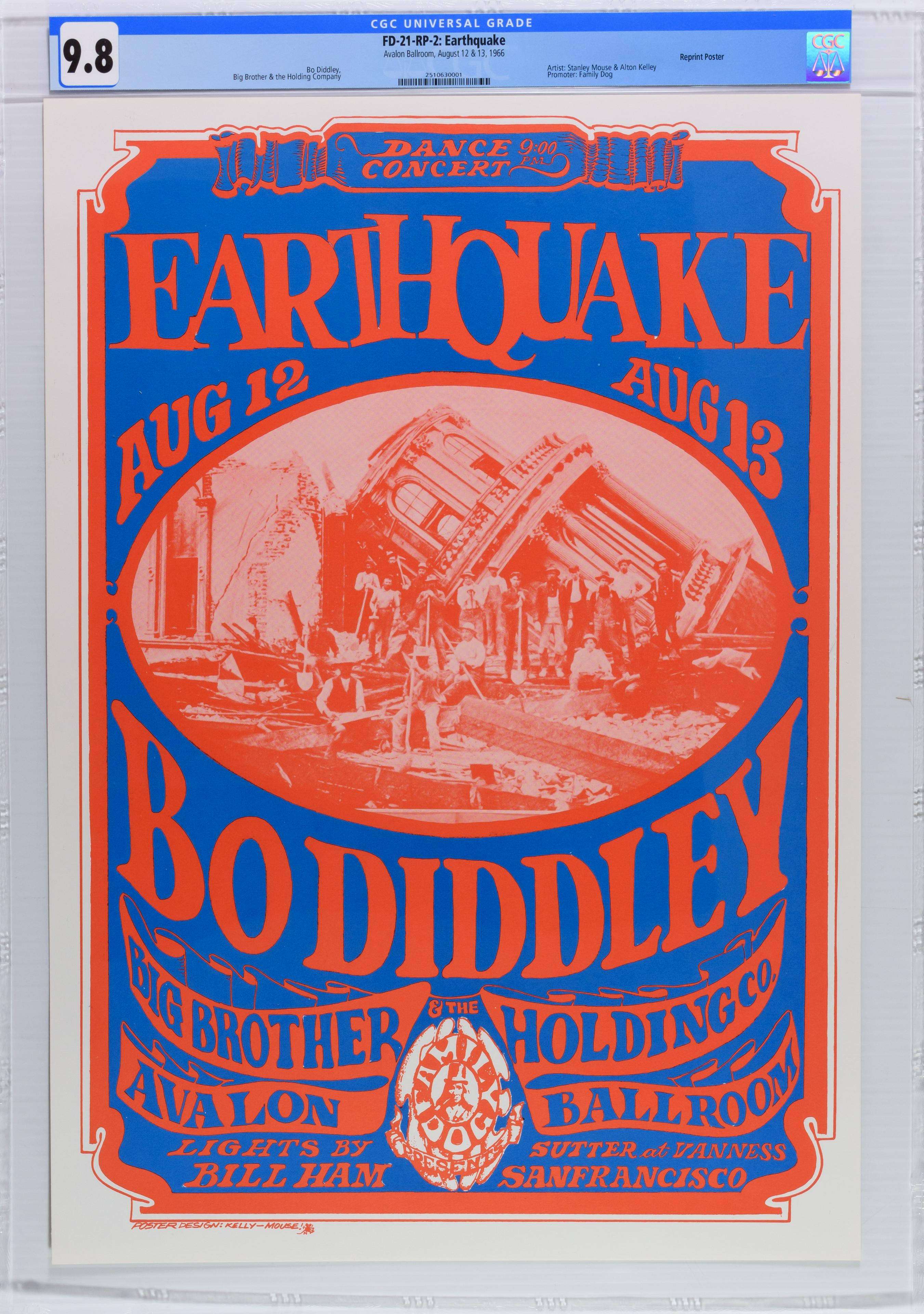 This Second Printing poster offers the same popular and iconic art for far less than a First Print currently commands! If you assemble a list of the five most favorite Family Dog Designs from 1966, this is sure to EASILY appear on most collector lists. This Stanley Mouse and Alton Kelley classic FD-21 Avalon poster depicts the devastation from the “Great Earthquake”, one of the most important events in California history.