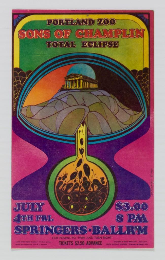 Concert Handbill printed on card stock and another GREAT design by former Fillmore poster artist extraordinaire, Jim Blashfield, in multiple psychedelic colors. The image features Parthenon on a hill with a flask of sperm moving up the narrow neck penetrating the hill's labia like surface.