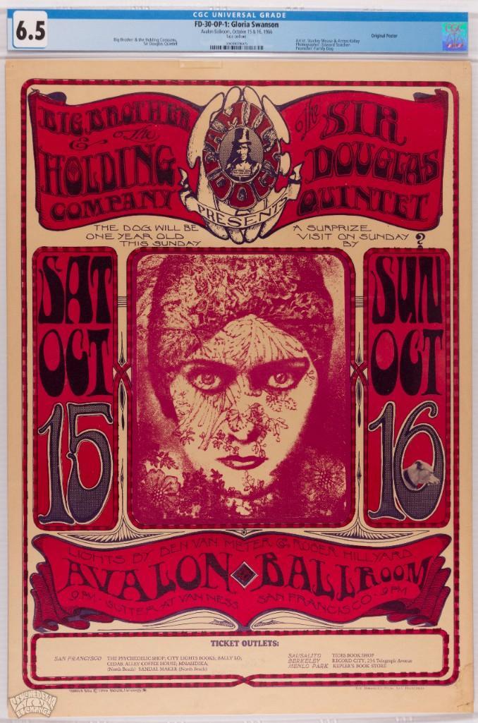 This Original Printing poster was created by the legendary artists Alton Kelley and Stanley Mouse, and features a fabulous image of silent movie star, Gloria Swanson. Collectors love this popular piece. A great poster from the early days of the Avalon…beautiful design, famous artists, and great bands.