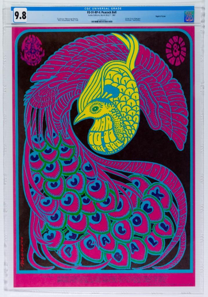 This poster for the "Peacock Ball" is one of artist Victor Moscoso's most popular designs from the series. You can clearly see the progression of his artistic style developed with groundbreaking experimentation throughout the series. This reprint poster offers the same popular and iconic art for far less than a First Print currently commands!