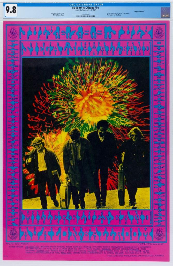 This often-overlooked Family Dog Poster explodes with several shades of yellow, gray, blue, red, green, and black on a pink background. Named "Chicago Fire", this piece showcases some killer Moscoso lettering! Superb Museum Quality Condition!