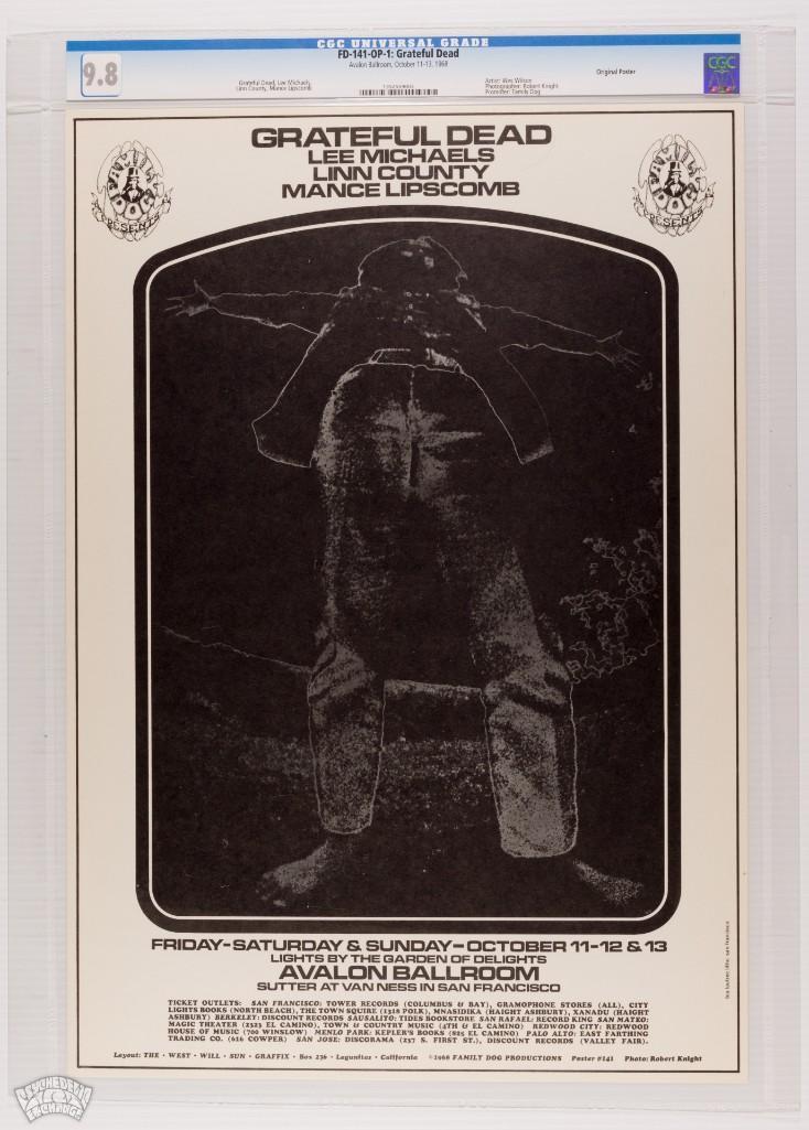 This later edition, original Avalon poster featured the Grateful Dead for a three night run in October of 1968. Produced by the late great Wes Wilson, this black and white image is from the final days of Family Dog at the Avalon. The budget was small for producing posters by this point in the series and the promoter was only able to produce black and white images.