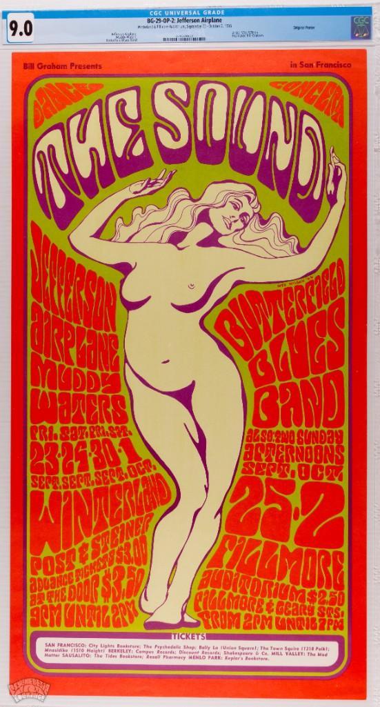 Hunted profusely by collectors around the world, the BG-29 Original First Printings were produced in both color & black/white versions. The “Sound” was Bill Graham’s own description of what was going on both musically and socially in San Francisco in October of 1966. Artist Wes Wilson used Bill's words as the inspiration for this classic Fillmore poster. This over-sized poster is a perfect example of Wilson's art at the time. It is widely considered to be one of the finest Fillmore designs ever issued, and totally encompasses the scene during this historic era.