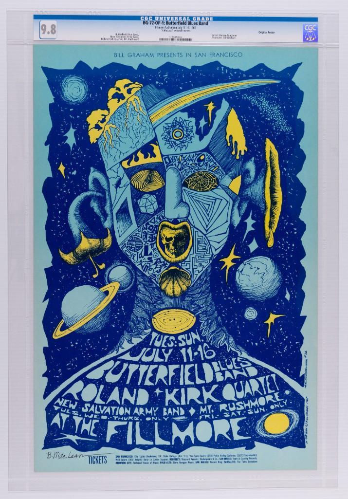 Yet another original Butterfield Blues Band Fillmore poster in this sale; this one by Bonnie Maclean! The Chicago Blues Band was joined at this appearance at the Fillmore by the Avant-Garde Jazz multi-instrumentalist Rahsaan Roland Kirk. This original first printing example is in perfect 9.8 Museum Quality condition!
