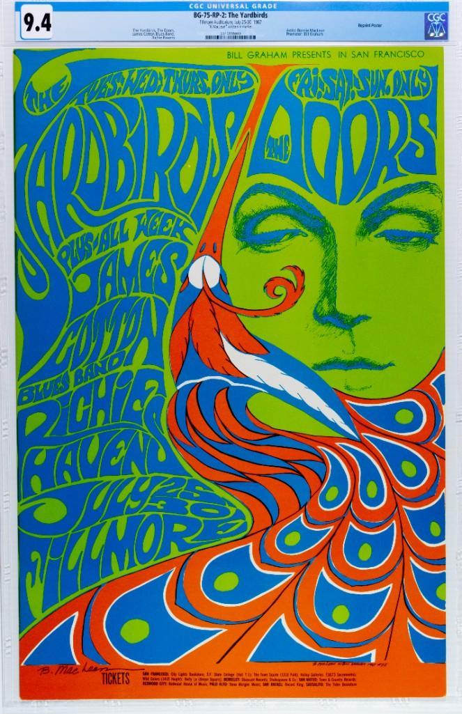 This second printing poster offers the same popular and iconic art for far less than a First Print currently commands! The World Famous BG-75 is one of the KEY issues in the Bill Graham Fillmore Series. It features spectacular, super popular art for one of the most beloved bands in the history of Rock and Roll. The Doors enjoy huge international interest and demand that dwarfs the worldwide interest for most other bands of the era.