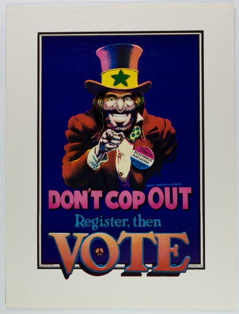 This satirical poster by comic artist Dave Sheridan features an image of a figure labeled James Barleycorn McDope wearing a pin reading "it's time to decriminalize marijuana, vote McDope in '72". Underneath it reads Don't Cop Out, Register then Vote. A great image that is as relevant today as it was nearly 50 years ago!