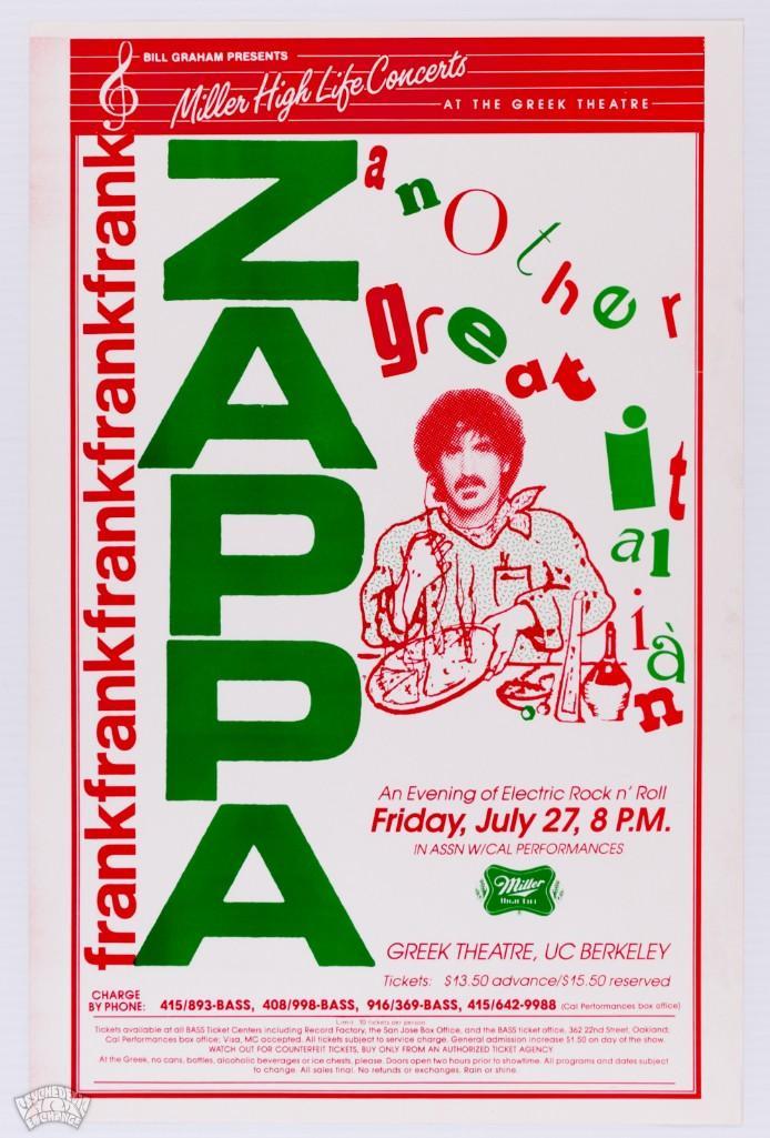 An original Frank Zappa concert poster in museum quality condition with no tears or pinholes! This show took place at the historic Greek Theatre on July 27th 1984. Original printing, legendary band, iconic venue, high quality condition... this lot has all the bases covered!