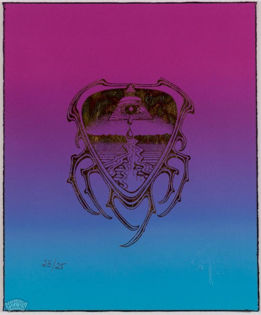 Rick Griffin, Pair of Crying Eye silkscreens. Both are LE # 39/100. These are Two separate silkscreen series. A black & White on deckled edge rag paper, Estate Griffin signature embossed. Both Produced by Flourescent Smogg. One edition is a split fountain screen print on black paper with metallic inked image, also Estate Griffin embossed signature. Includes Letters of Authenticity.