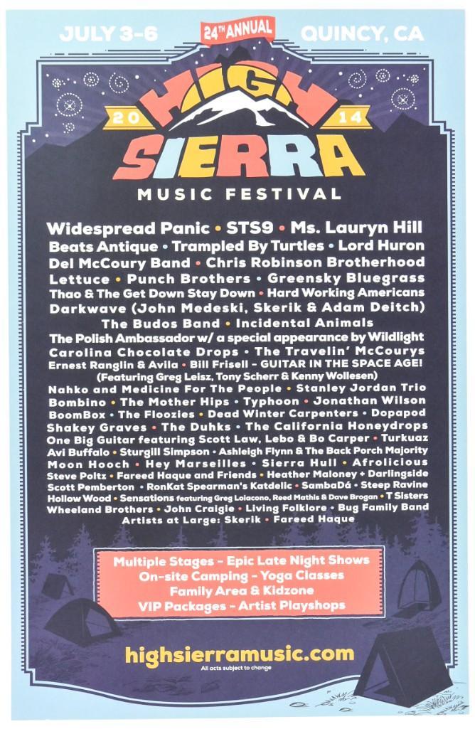 This is a special collection of 6 high quality High Sierra Festival original concert posters! High Sierra 2014, Size 10.97 x 16.97, Heavy Stock. High Sierra 2013, Size 12.50 x 18.50, Heavy Stock. High Sierra 2002, Size 12.50 x 18.50, Heavy Stock. Corner crease bottom left. High Sierra 2004, Size 13.00 x 19.00, Heavy Stock. Thin edge crease top right corner. High Sierra 2014, Size 13.00 x 19.00, Heavy Stock. High Sierra 2000, Size 13.00 x 18.88, Heavy Stock. Some edgewear.