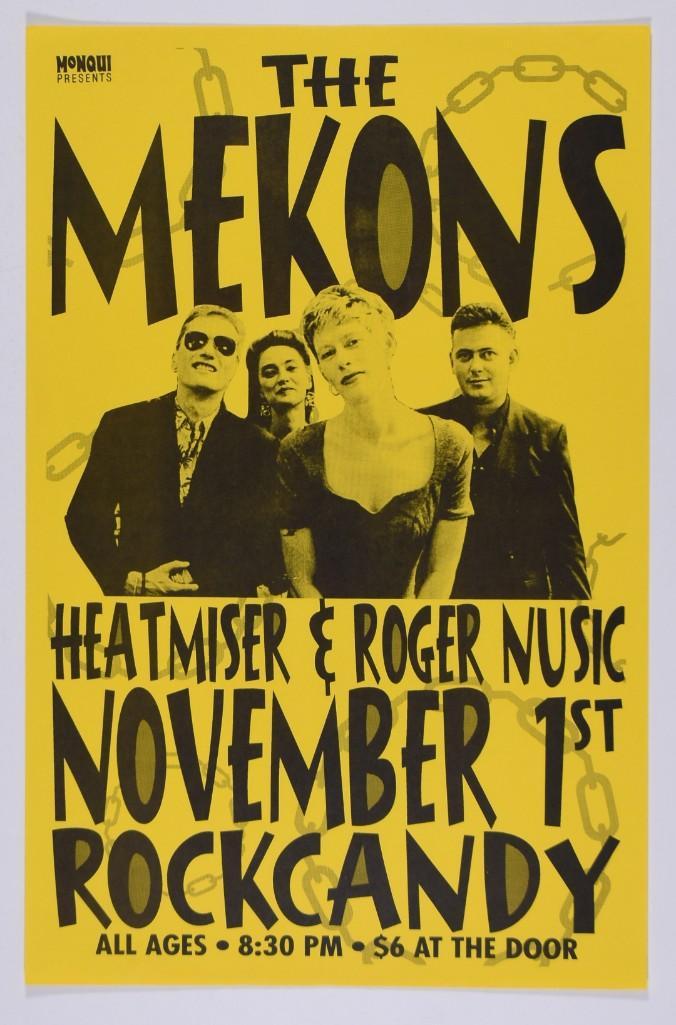 This poster advertised a lineup featuring British post-punk band Mekons along with Heatmiser, Elliott Smith's band prior to his solo career, and Roger Nusic. The show occurred at Portland, Oregon's Rockcandy in November 1994. Material from the pacific northwest is always considered special by collectors. They often tell a story all their own and have a different vibe than pieces from other parts of the country. It's hard to believe this poster is over 25 years old. Telephone pole flyers like this are highly collectible and are notably representative of the music loving culture that produced them.