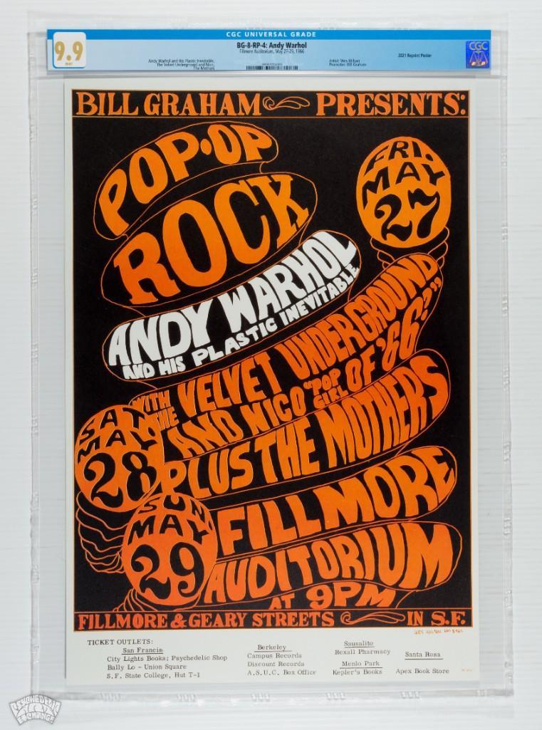 Here we have a fourth pritning poster of one of the most desirable images of the era. Here is your chance to own a CGC graded example of this classic without spending the thousands of dollars the original printing can realize! THERE IS NO BIGGER NAME IN THE ART AND COLLECTIBLES WORLD THAN ANDY WARHOL. Period. It is indisputable and will in the long run be the overriding fact that determines the future value and desirability of this poster. We always have a mile-long list of collectors eager to acquire this amazing poster. It also features one of the most exciting lineups ever to appear at the Fillmore! How do you top Warhol, Zappa and Lou Reed? Superb Museum Quality Condition!