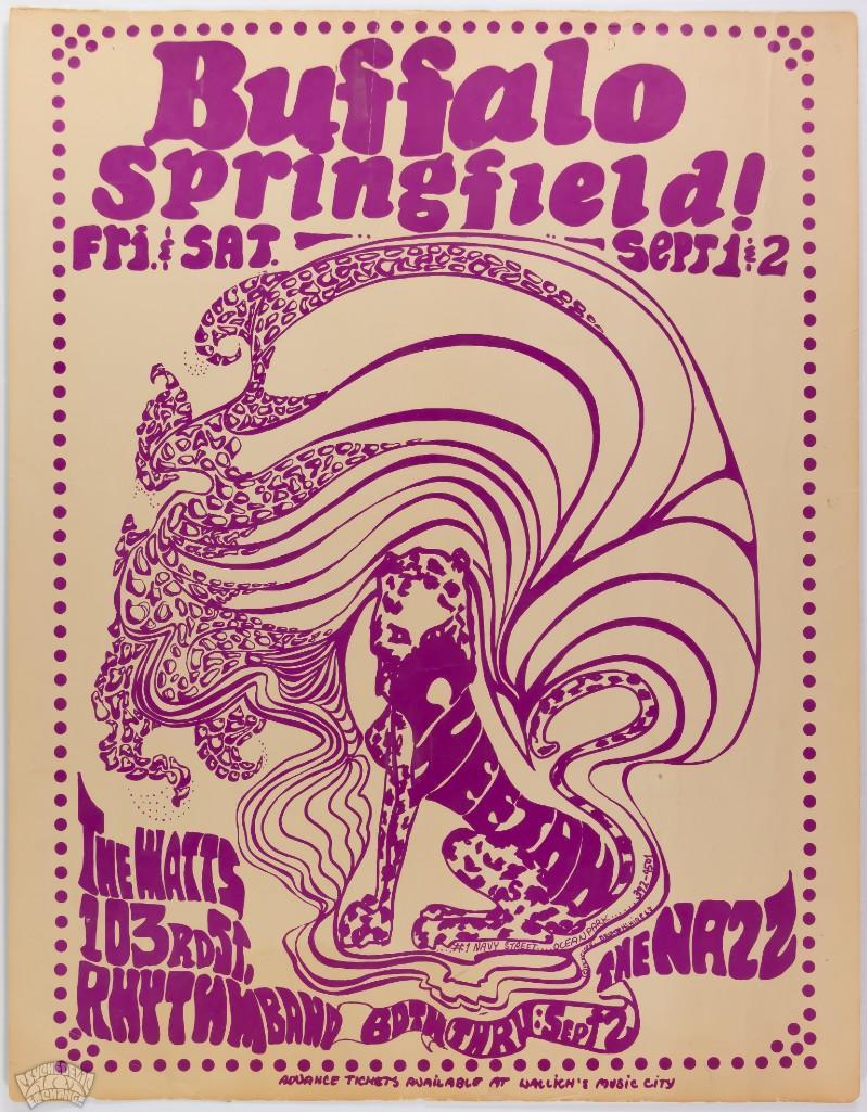 We are thrilled to be offering this poster for the FIRST TIME in our auction! Though we have previously sold the handbills for this run of shows, the poster hadn't come our way until now. Buffalo Springfield was the Rock/Folk springboard that launched several prominent Southern California musicians and one noteworthy Canadian the great Neil Young. This run at the Cheetah were some of the last shows with original bass player Bruce Palmer. Four months later he was deported a second time for drug possession and replaced by Jim Messina.