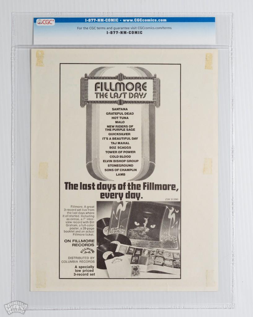 This handbill by artist David Byrd advertised Fillmore The Movie, a documentary about the legendary San Francisco venue. The film focused on a few of the venue's final concerts which featured many of the greatest 1960s psychedelic acts such as Santana, The Grateful Dead, Quicksilver, and more! 100% original with no restoration.