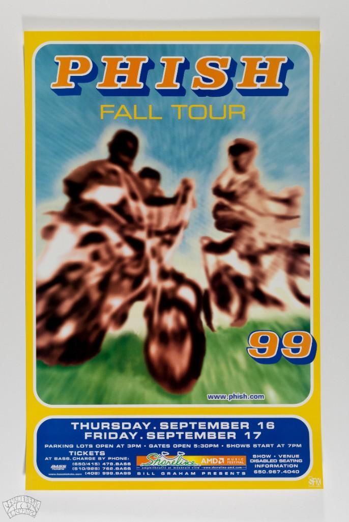 Here we are offering a poster created for a two night stop on Phish's 1999 Fall Tour! The shows took place at the Shoreline Amphitheatre in Mountainview, CA on September 16th and 17th. 100% original with no restoration!