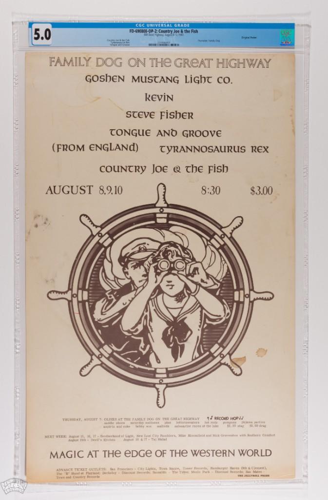 We are excited to be offering this poster for the FIRST time in our auction! This issue titled FD-690808 was created for a string of shows promoted by the Family Dog, yet the poster falls outside of the FD numbered series. The shows advertised took place at 660 Great Highway and featured Country Joe and the Fish, an EARLY T-Rex, Tongue and Groove, and more! This poster does not appear for public sale often, don't miss out!