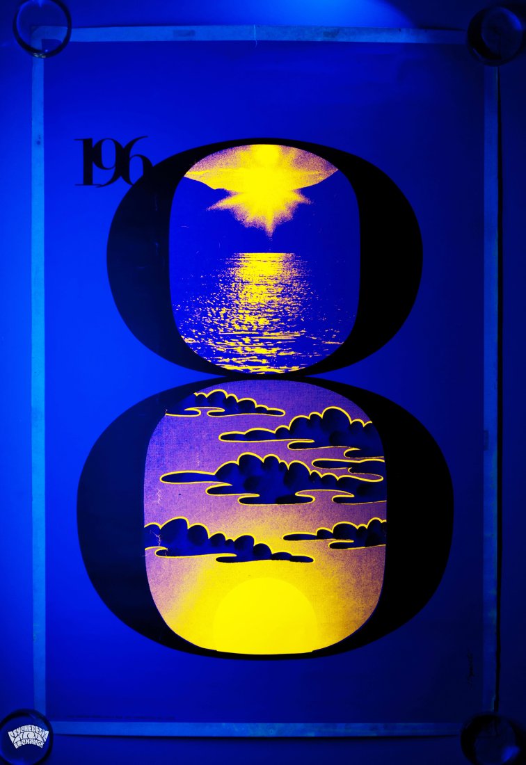 This headshop poster from 1968 commemorating the year was designed by John Sposato. It changes colors and glows brightly under a blacklight! Produced by Pandora Productions on ultra high quality paper stock. "Item 55". Pandora Productions.