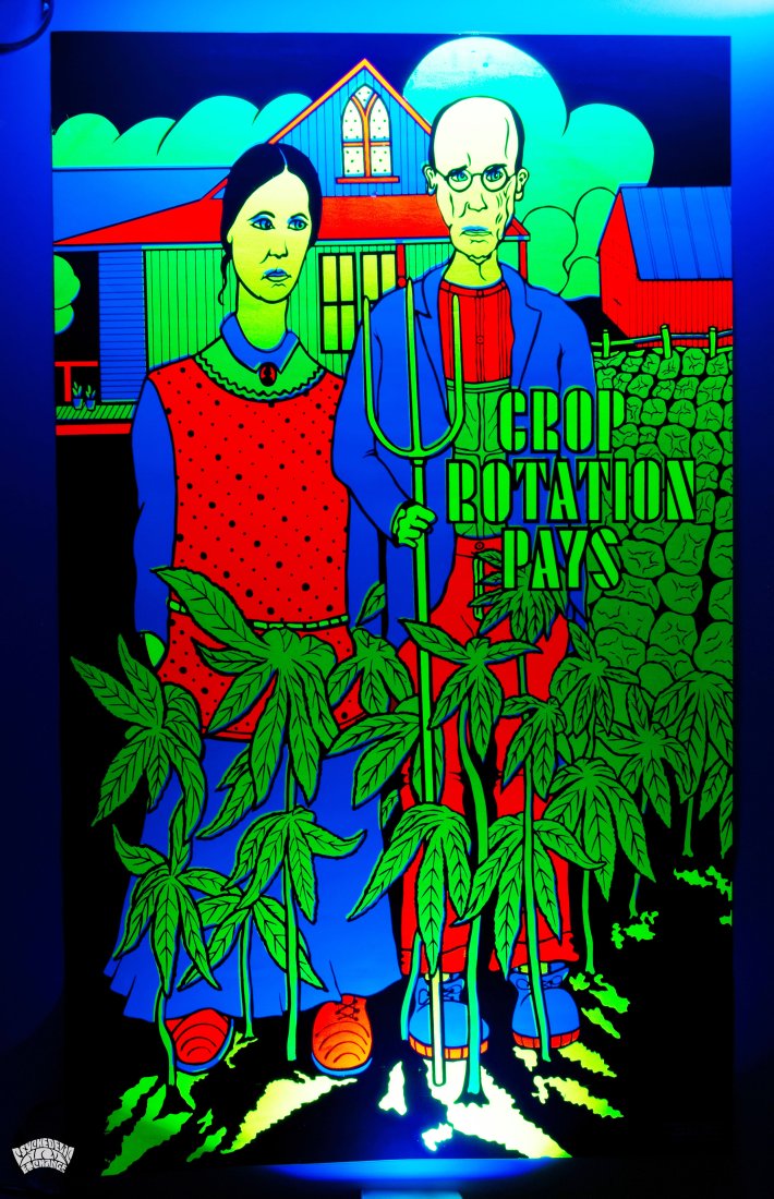 A splendid pro-legalization of marijuana headshop poster based on the iconic 1930 painting by Grant Wood called "American Gothic". Produced in 1969 by Compass Points in Memphis Tennessee with bright bold blacklight colors.