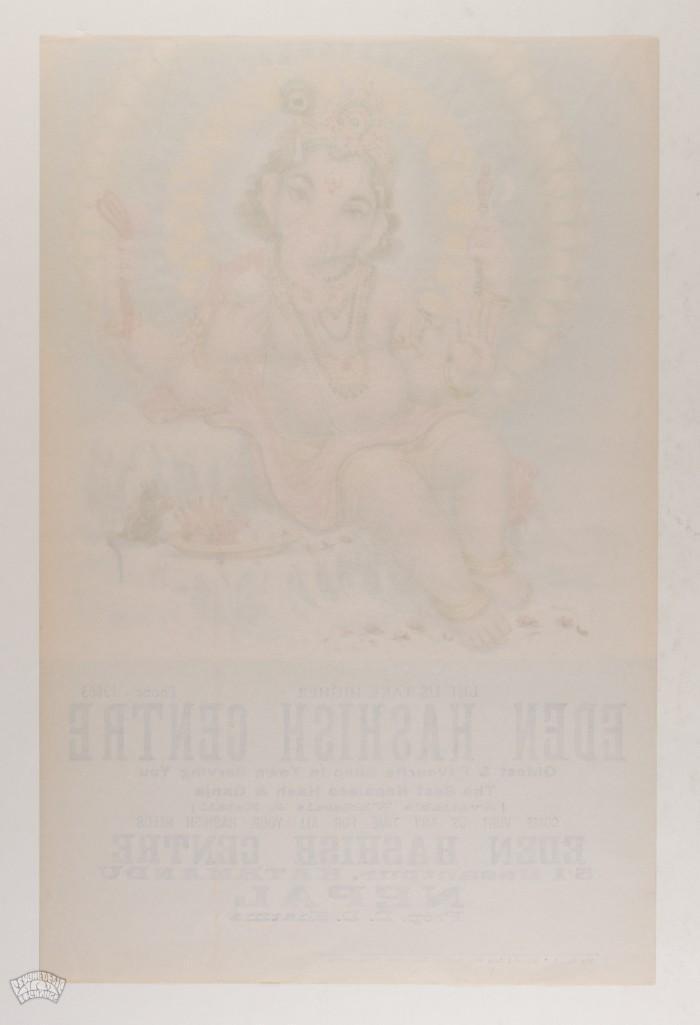The Eden Hashish Center operated in Katmandu, Nepal from 1962 thru 1973 when they were shut down by the Nepalese government due to pressure from the Nixon administration. Until then, cannabis products were sold legally by licensed shops much like in the Netherlands. The centre created a run of posters that featured various Hindu deities as well as other enlightened beings. These images are both mystifying and beautiful. They utilized modern printing techniques that had previously been scarce in that part of the world.