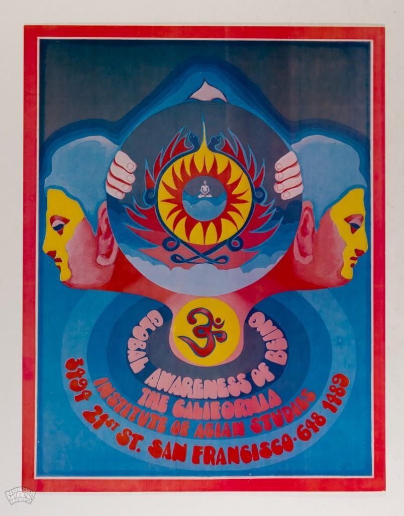 The California Institute of Asian Studies celebrated Global Awareness of Being in this original poster. The institute studied Eastern culture and philosophy, while further developing in this direction with a perspective that sought a holistic view of the human being. In addition, an integration of material and spiritual values, and eastern and western worldviews.