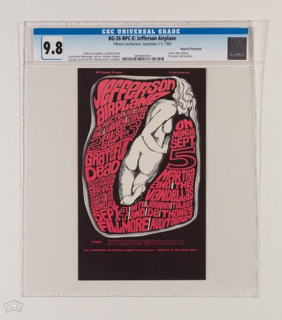 This second-printing postcard offers the same great art as the original poster for just a fraction of the cost! The BG-26 is yet another creative leap forward for the work of Wes Wilson. This design represents the first time that the artist would incorporate a nude figure into his Fillmore poster art. This would be a reoccurring theme in Wilson's work for the remainder of the time he was enlisted by Bill Graham.