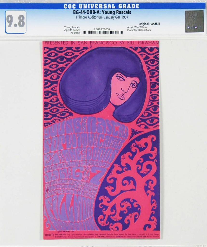 This 1967 original handbill most notably announced the first appearance of the DOORS at the Fillmore. Wes Wilson's use of purple and pink in this classic design is yet another salute to the feminine. This handbill is fabulous in both design and condition! Doors material enjoys worldwide appeal and we expect this high-grade handbill to enjoy bidder attention!