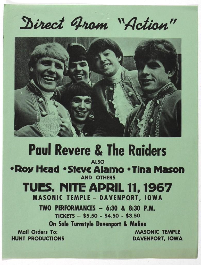 This flyer advertised Mark Lindsay's iconic band Paul Revere & The Raiders playing at the Masonic Temple in Davenport, Iowa on April 11th, 1967. By this time in the group's career Lindsay was working not only as the singer but also as a composer and producer. 100% original.