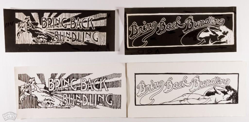 This collection of original art was designed by Tad Hunter, AKA San Andreas Fault, a prominent 1960s concert poster artist who created many well loved posters that regularly appear in our auctions. This lot features several pieces of original vintage artwork that all appear to have been designed for KMPX station stickers. Each one reads "Bring Back Bundling". A very unique and interesting collection.