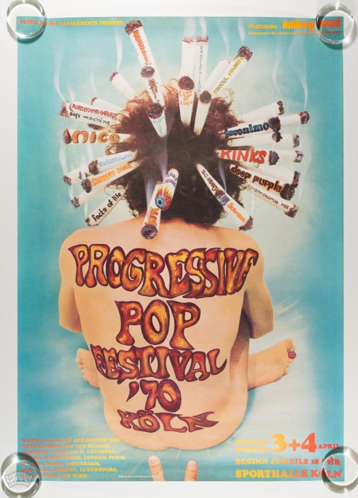 Here is a RARE issue that announced the Progressive Pop Festival in Cologne, Germany that occurred over two days in April 1970. The excellent lineup included The Kinks, Deep Purple, Procol Harum, Yes, Tyrannosaurus Rex, and more. This is the first time this poster is appearing in our auction and it is in STUNNING condition!