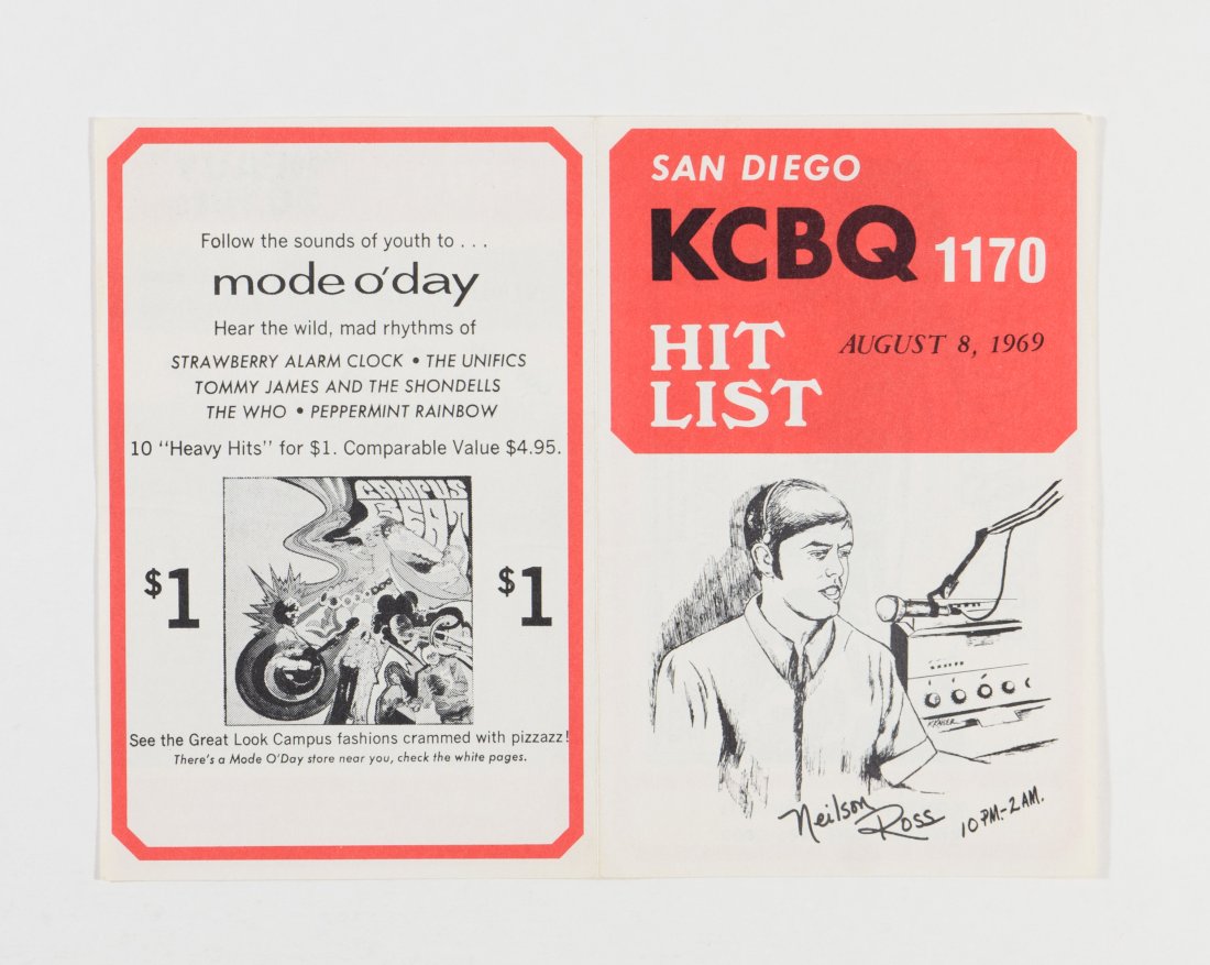 This handbill was produced for the KCBQ Radio Station San Diego Hit List for the week of August 8th, 1969. It also features a plug for a Led Zeppelin and Jethro Tull show occurring at the Sports Arena in San Diego on August 10th, exhibiting the design for the concert poster of that event!
