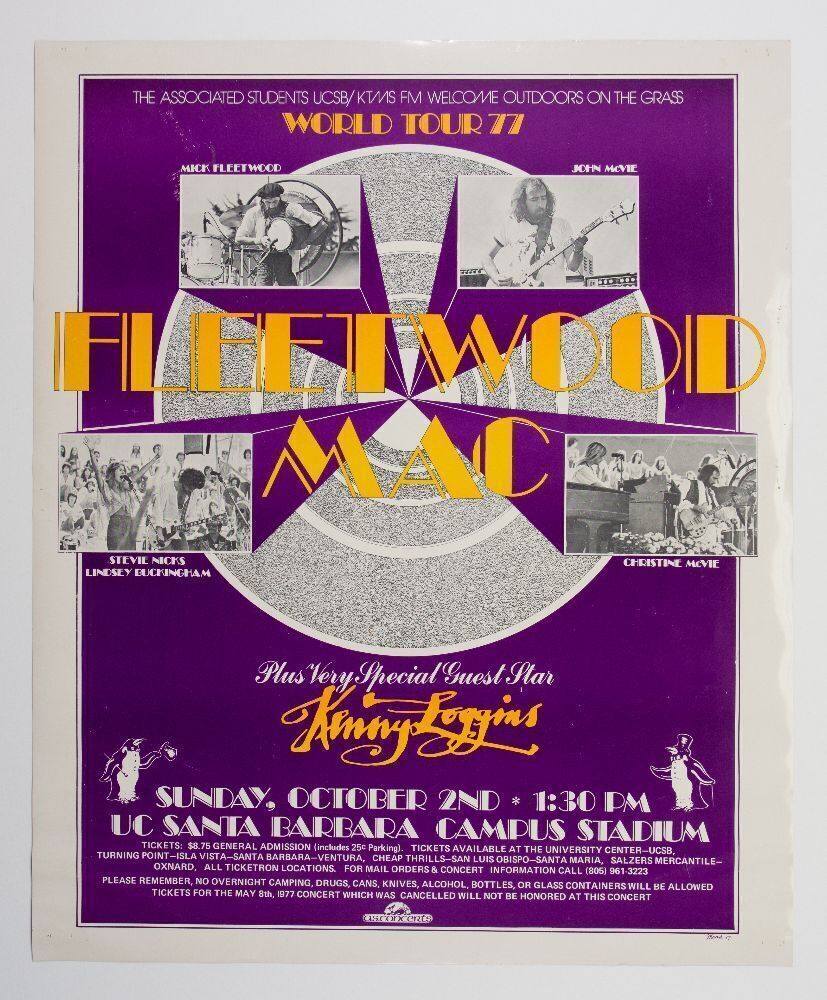 This original first printing poster was produced to promote Fleetwood Mac, with Kenny Loggins in support, appearing at the UC Santa Barbara Campus Stadium in October 1977. This was at the boom of Fleetwood Mac's career during the Rumors tour, and what would be considered their "classic" lineup of John McVie, Lindsey Buckingham, Stevie Nicks, Mick Fleetwood, and Christine McVie. Buckingham and Nicks joined the band on New Years Eve in 1974. This is the FIRST time this poster is appearing in our auction!