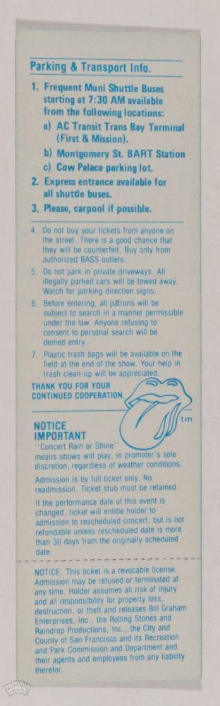 This unused concert ticket was for the Rolling Stones playing at Candlestick Park in San Francisco on October 17th, 1981. Historical unused tickets for iconic performers remain one of the most valued in the music memorabilia market today. Mainly focusing on posters and handbills we at PAE seldom see them come through the door so this is a real treat for us to offer this one!