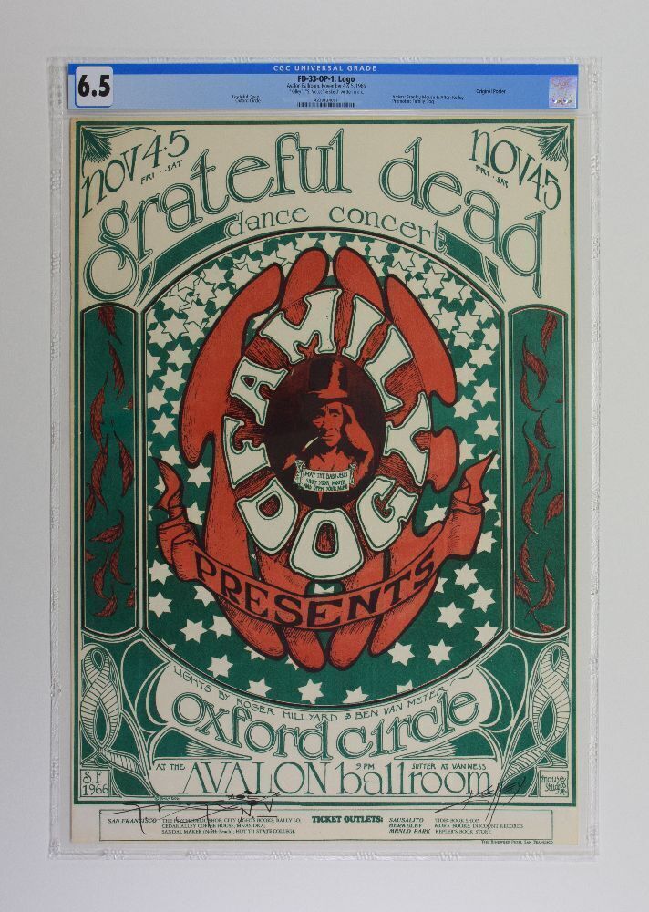 Presenting an exciting example of this first printing poster in our auction! The FD-33 is one of the most sought-after Grateful Dead posters in the Avalon Series. This striking yet simple design by Mouse and Kelley utilizes the Family Dog logo in striking Green and Red. A very tiny fraction of the original issuance has survived the past 55 years!