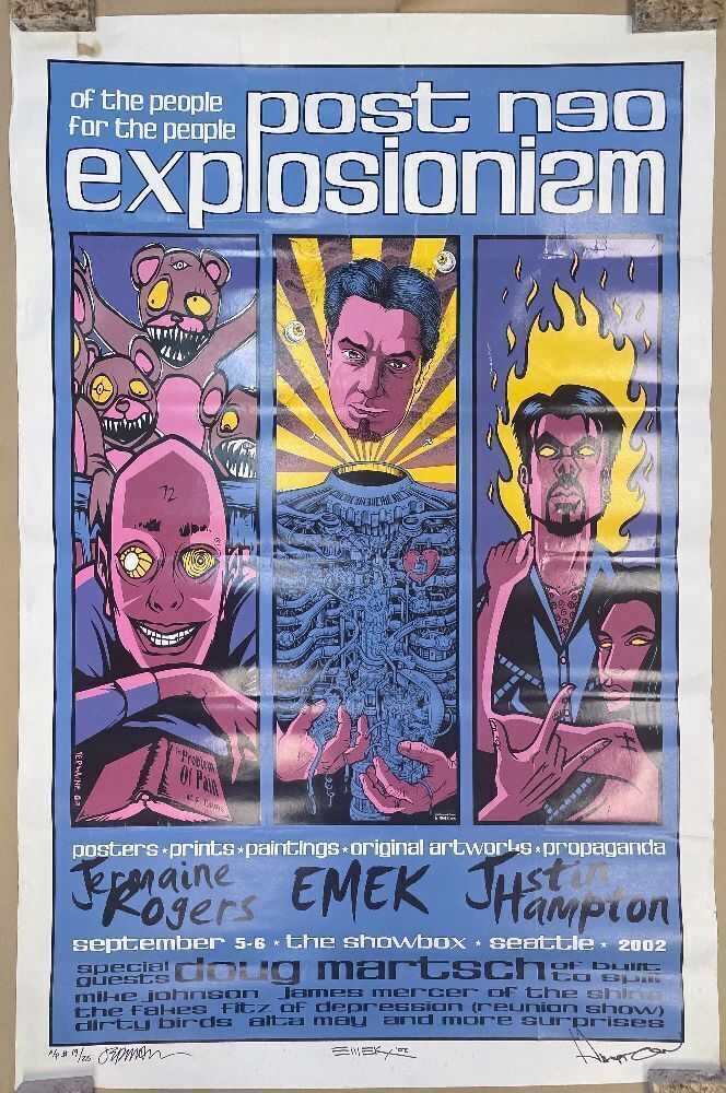 This super limited-edition artist's proof poster was a collaboration between three of the greatest names in the world of modern gig posters: EMEK, Jermaine Rogers, and Justin Hampton! Each artist created a panel of the three-panel design, which promoted a poster and music show at Seattle's Showbox in September 2002 featuring the artwork of these three artists. Musical acts included Doug Martsch from Built to Spill, James Mercer of The Shins, The Fakes, Fits of Depression, and more.