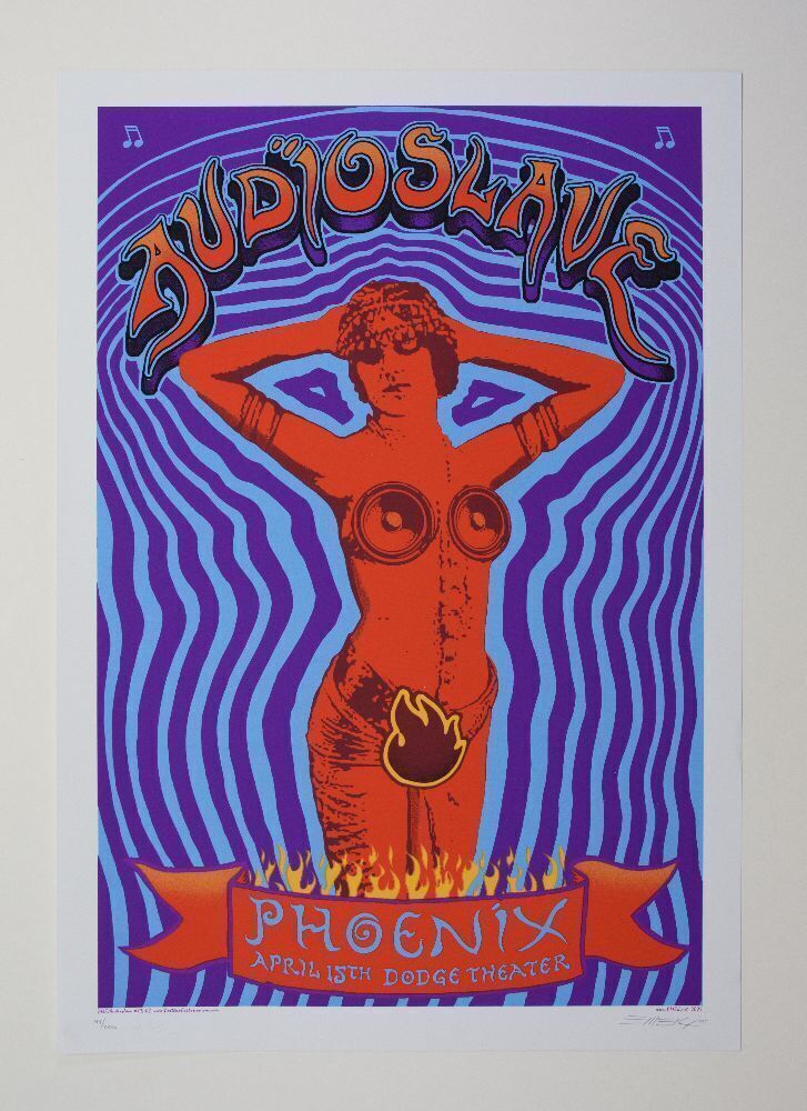 This screenprint poster by artist Emek was created for Audioslave's April 2005 at the Dodge Theater in Phoenix, Arizona. Audioslave was a supergroup fronted by Chris Cornell of Soundgarden and featured Rage Against the Machine Members Tom Morello, Tim Commerford, and Brad Wilk.