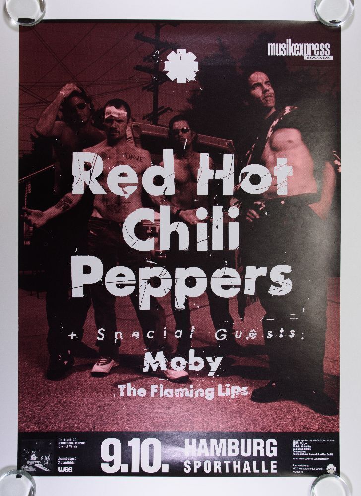 This large German subway poster from October 1995 announced the Red Hot Chili Peppers appearing at the Sportshalle in Hamburg Germany during their One Hot Minute tour. The Flaming Lips and Moby were in support. This is the FIRST time this poster is appearing in our auction!