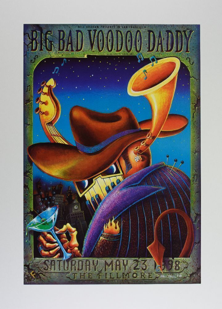 Big Bad Voodoo Daddy is an American contemporary swing band that emerged in the 1990s as part of the neo-swing revival. This poster was produced for the band's appearance at The Fillmore on May 23 1998. Emek has been celebrated as one of the top modern-era poster artists by his colleagues and fans alike. Small runs of signed material will always be one of the major keys to the kingdom in the world of collecting rare trophies.