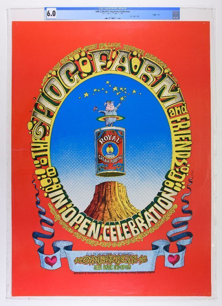 Here we have a killer design by the legendary Rick Griffin for the Hog Farm hosting a series of Thursday night "Open Celebrations" at Cinemateque 16 on Sunset Boulevard in Los Angeles during 1969. Wavy Gravy’s hog farm is the longest running hippie commune ever and is perhaps best known for their involvement with the 1969 Woodstock Music Festival. This is just the SECOND TIME we are offering this original OP-1 printing in our auction! Don't pass this one up!