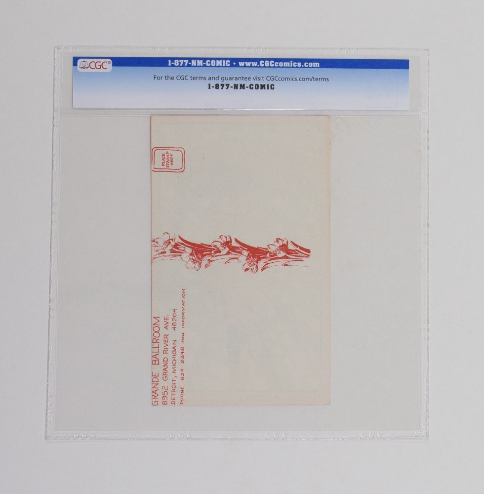 This piece is extremely hard to obtain and highly coveted by collectors worldwide. The late great Detroit artist Gary Grimshaw rendered this piece for a 1968 Hendrix show at Detroit's Masonic Temple. There were no pre-concert posters created for this event only postcards! This is the version with red ink on the back (OPC-C) and was used to send to the Grande mailing list.