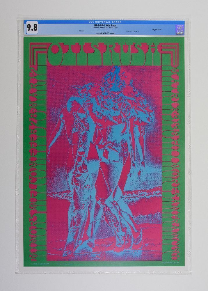 Only first original pre-concert printings of this issue were produced, no second printings exist. Chicago blues legend, the late great Otis Rush passed away over two years ago but interest in his concert material continues to live on. This poster is the 8th produced by artist Victor Moscoso for his retinal burning Neon Rose series. It was printed in 1967 for a run of shows at the Matrix in San Francisco. The design was based on a photo by Paul Ubac.