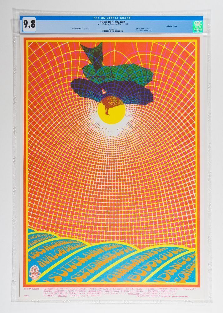 Artist Bob Fried created this stunning geometrical, psychedelic poster. Fried's use of crisscrossing diagonal curved lines is brilliant and dizzying. This artist used the effect several times, most notably in his 1967 translucent Grateful Dead poster.