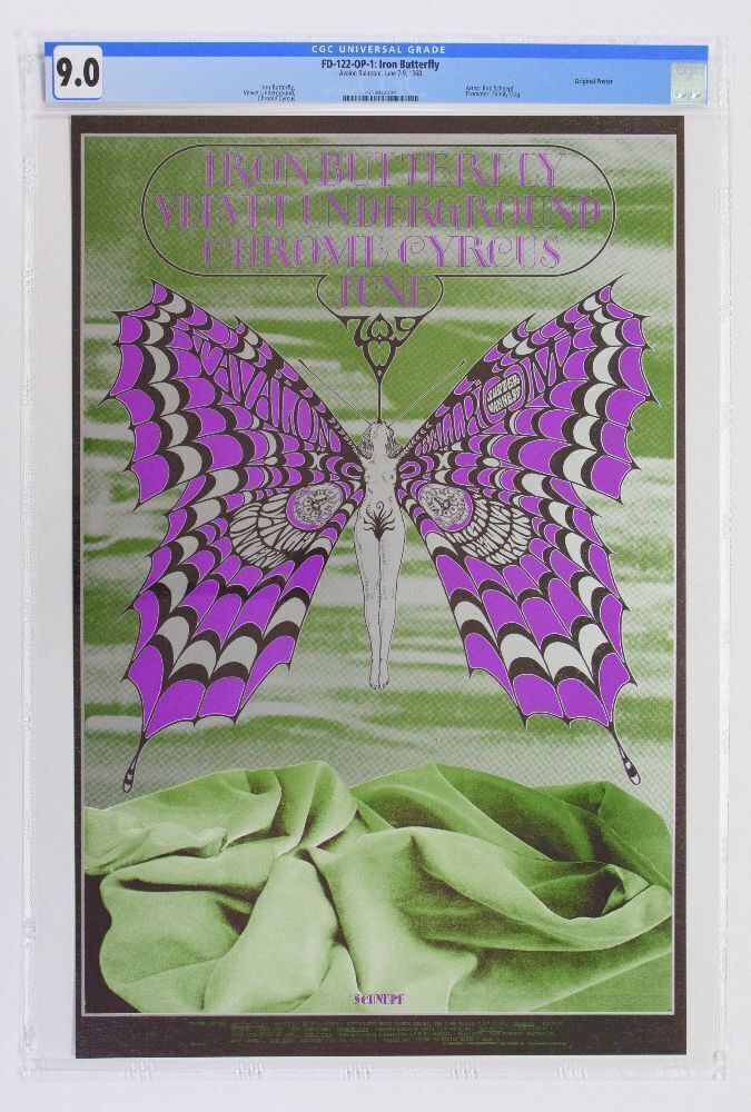 This original poster for an Iron Butterfly show at the Avalon with The Velvet Underground in support is one of the most frequently requested posters from the Family Dog series. It is interesting that the Velvet Underground was not the headliner. We imagine that, at the time, Iron Butterfly was considered more of a draw. This show was just a week before the release of the band's best-selling album, In-A-Gadda-Da-Vida, which contained a 17-minute version of the title song.