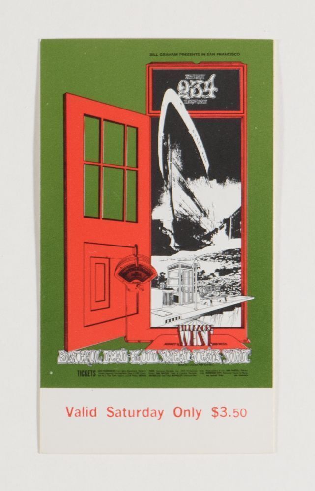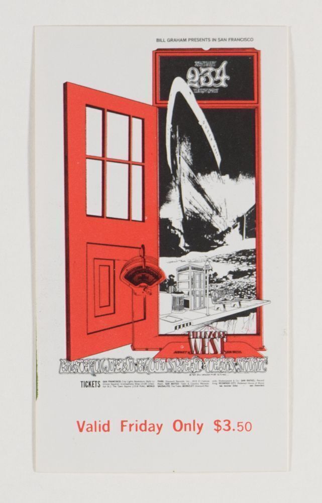 This lot features a set of 3 tickets from these shows that features the same beautiful artwork by Randy Tuten! The tickets cover all 3 nights of the 1/2-4/1969 run of shows. This 1969 Randy Tuten collage was created for a Grateful Dead Fillmore West run of shows. It depicts the Queen Mary (one of the most famous ocean liners of all time) overtaking the city of San Francisco. Extremely popular Bill Graham issue.