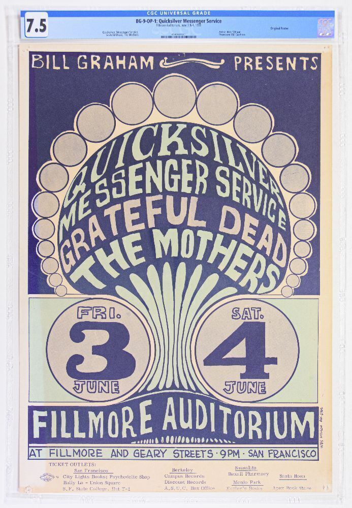 This BG-9 pre-concert first printing is a Wes Wilson classic, and it's the Bill Graham poster that advertised the FIRST appearance of the Grateful Dead at the historic Fillmore Auditorium. Early Fillmore posters are always in TOP demand by collectors, and this original first printing issue is VERY difficult to find, in ANY condition.