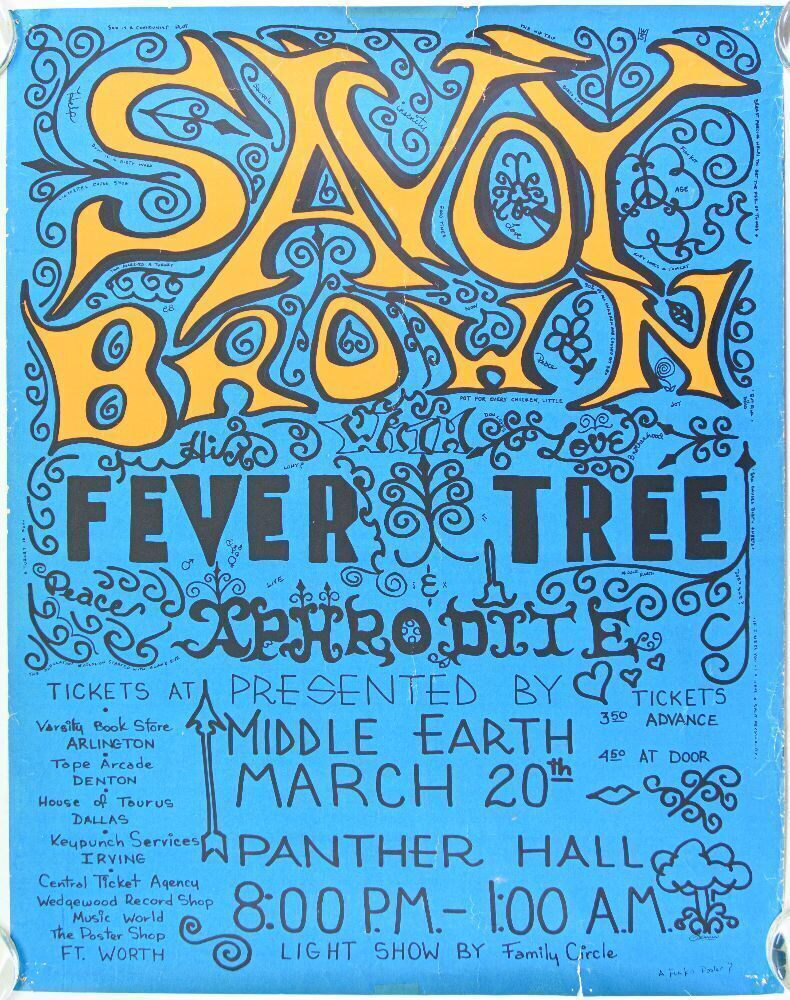 This poster announced the appearance of Savoy Brown at Panther Hall in Ft. Worth, Texas on March 20th, 1969. The show was put on by a local promoter named Middle Earth Productions. Panther Hall original posters are rare and seldom surface in ANY condition. Don't overlook this one!