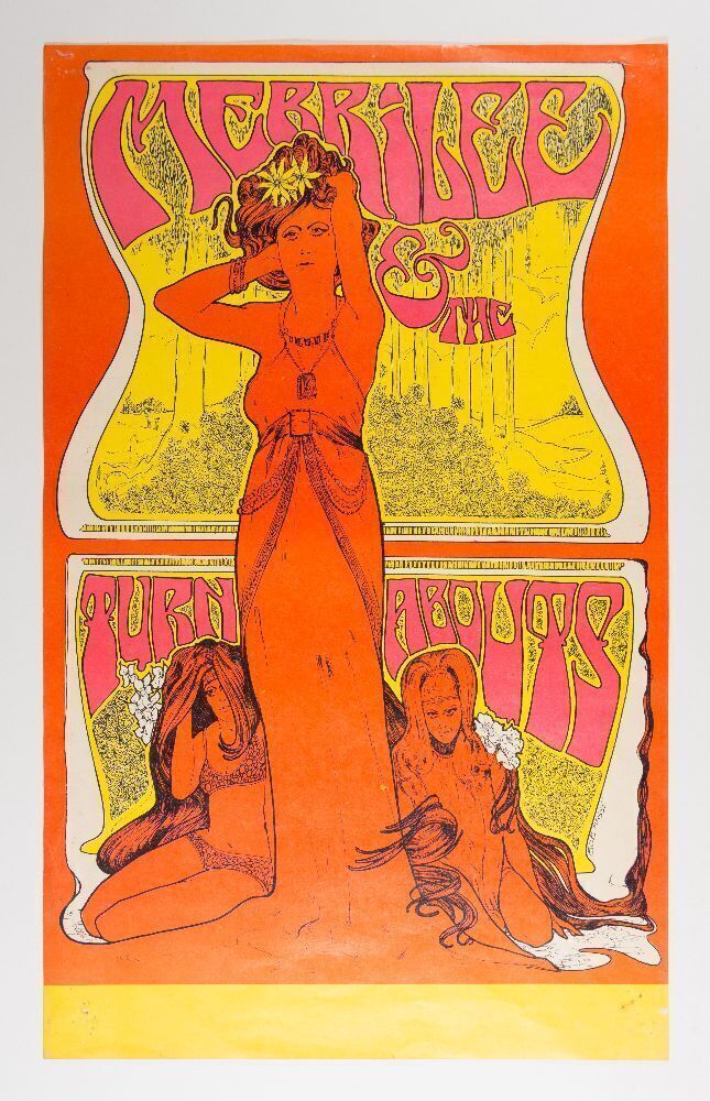 This vintage, Original Poster for Merrilee Rush & The Turnabouts was designed by Canadian artist Bob Masse. Merrilee & The Turnabouts became a popular act on the Pacific Northwest's teen dancehall circuit, touring throughout Washington and Oregon during the late 1960's. The group was invited to be the opening act on Paul Revere & the Raiders tour of the southern United States in 1967. Bob Masse is one of rock's most seasoned and prolific poster artists. He is perhaps best known in the collecting world for his design of the July 1967 Grateful Dead concert at Vancouver's Agradome. His work has been hunted by collectors for decades and remains one of the most celebrated artists of the era.