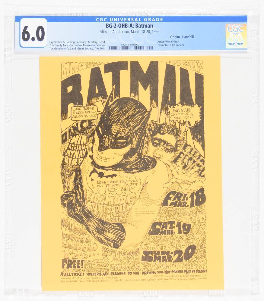 The BG-2 Original Handbill was printed on thin tan paper and was only printed once before the concerts. This "Batman" image was the first created for the Fillmore Numbered Series by artist Wes Wilson.